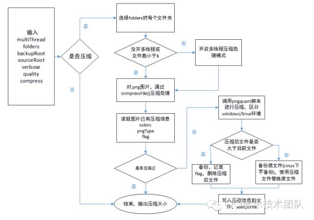 从压缩流程图中可以知道,在项目资源目录下PNG图片数据过多时,默认应该采用多线程执行压缩脚本,为了避免出现重复压缩的情况,在进行压缩之前需要读取图片的压缩信息,压缩过的不再压缩,同时,压缩完成后,需要对压缩处理过的图片写入压缩信息,方便下一次读取。由于pngquant脚本的特殊性,需要判断压缩后文件是否大于原始文件,大于则需要删除并记录。