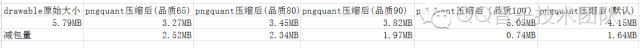 使用pngquant脚本压缩资源目录res下的drawable、drawable-hdpi、drawable-ldpi、drawable-mdpi、drawable-xhdpi、drawable-xhdpi-v21、drawable-xxhdpi、drawable-xxxhpi等8个文件夹,在多线程的情况下,共耗时17s940ms。主线48322版本的资源目录采用各种压缩品质(通过设置—quality参数实现)进行压缩,对比效果如下图,综合考虑压缩率和压缩后效果,最终采用品质为90的压缩方案,可以减包1.97MB。
