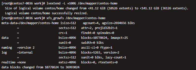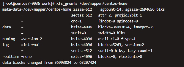 xfs_growfs /dev/mapper/centos-home ,使用 xfs_growfs 命令在线调整xfs格式文件系统大小(CentOS6使用resize2fs)
