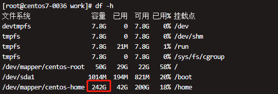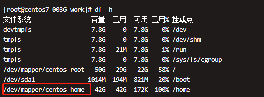 查看系统存储df -h ,文件系统/dev/mapper/centos-home为待扩容的lv ,其挂载点为/home目录