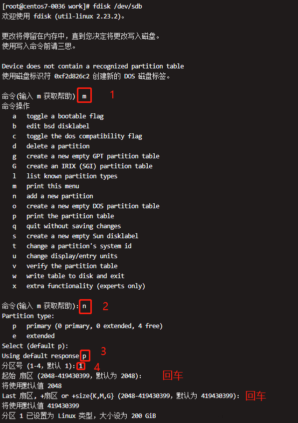 新硬盘分区 fdisk /dev/sdb ,大小200G