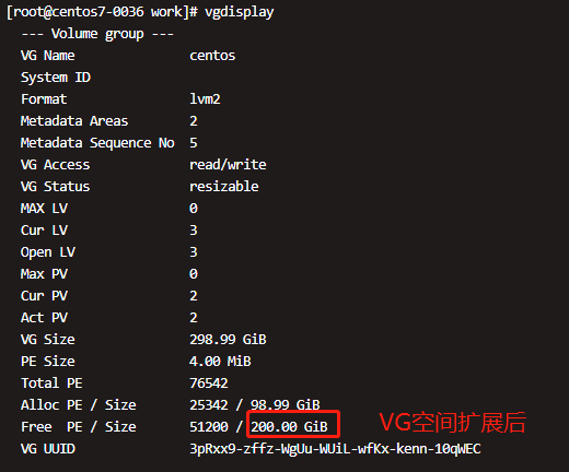 查看扩容后vg vgdisplay ,空闲空间变为200G,表示vg扩容成功
