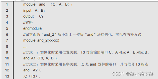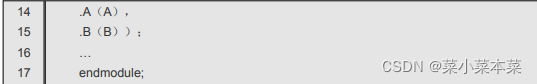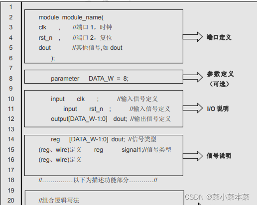 模块的名字和输入输出口。模块以module开始,endmodule结束。模块名是模块的唯一标识符,命名时以模块的功能命名,模块名和文件名相同。模块的端口表示模块的输入输出口名,是与其他模块联系的标识。