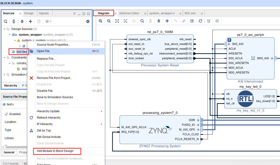 FPGA设计中使用原理框图输入方式,编写完一个模块后,选择该模块源文件点击鼠标右键会出现 Add Module to Block Design,如果没有出现这个选项,可能是模块中有语法错误,或者没有打开Diagram框图设计文件。