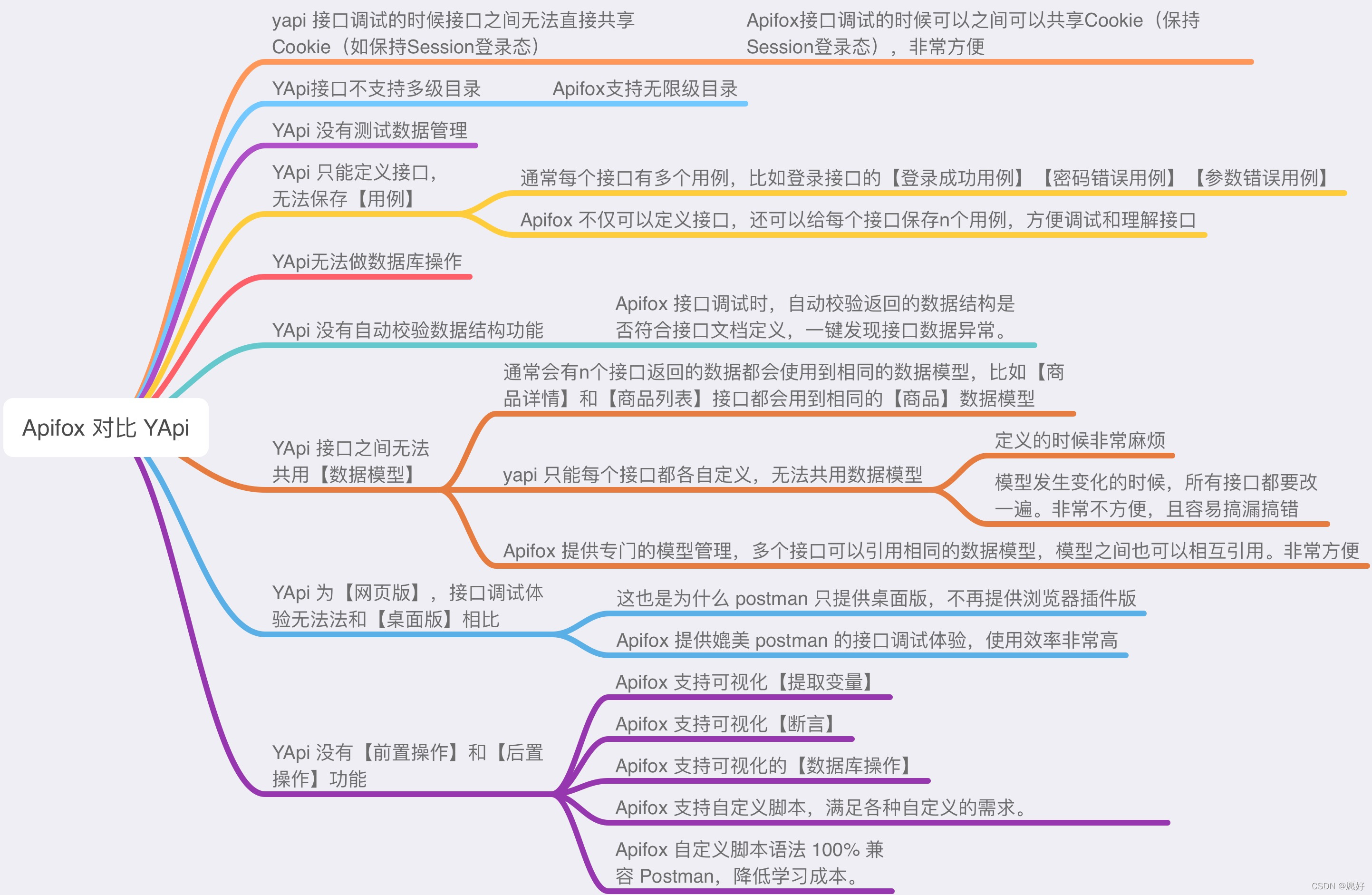 (一) 通过对官方文档学习和社群了解,在以下指标对APIfox与ApiPost进行对比: 定位、跨平台、功能、培训方式、费用、用户意见反馈、稳定性、社区活跃度、UI主题; 1、 定位:两者定位于API 设计、开发、测试一体化协作平台; 2、跨平台:都不限制平台; 3、功能: 功能差异不大,但APIfox有两点相较于APIPOST有优势, 3.1开放平台:apifox支持APIhub,apipost处于开发中, 3.2性能测试:apifox多线程运行只能利用单核CPU后续会优化支持多核CPU,APIPOST不支持性能测试; 4、培训方式:APIfox有PPT和官方文档,APIPOST有视频和官方文档; 5、费用: 5.1.APIFOX: saas版免费,无任何限制, 私有部署按使用人数收费; 5.2.APIPOST: 免费版:单项目公共注释上限20条、团队协作2读写工位、有广告, 个人版:360元终身,无新增读写工位, 创业版:1800元终身,新增5读写工位, 团队版:3600元终身,新增15读写工位, 企业版:7200元终身,读写工位自选, 私有部署收费; 6、用户意见反馈:都支持问答社区和微信群,APIPOST问答社区明显优于Apifox。 7、稳定性:主要涉及公司背景,APIPOST处于Pre-A轮,APIFOX处于A轮; 8、问答社区活跃度:APIPOST相较于APIFOX更活跃些。 9、UI主题:界面,UI、主题APIfox相对优于APIpost,主题支持更为丰富。 (二) 总结: 相较于YAPI,以上两个平台最大的优势在于: 效率高:文档、调试、mock、测试无需重复定义; 准确:一套系统、一份数据,解决多系统间数据同步问题; 及时性:接口定义和调试使用同一个工具,调试完即可保证和接口文档定义完全一致; 推荐:apifox,支持性能测试和APIHUB,可直接导出到jmeter,且有打造API网络生态意愿、最近获得3000千万融资; 最佳实践:一、团队管理:1、团队权限