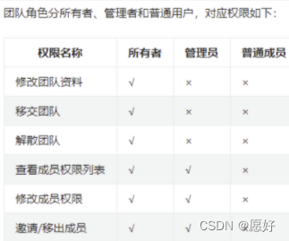 2、项目权限 为了满足团队的多层次管理需求,每个成员可以按项目设置管理员、普通成员、只读成员、禁止访问的角色,对应权限如下: