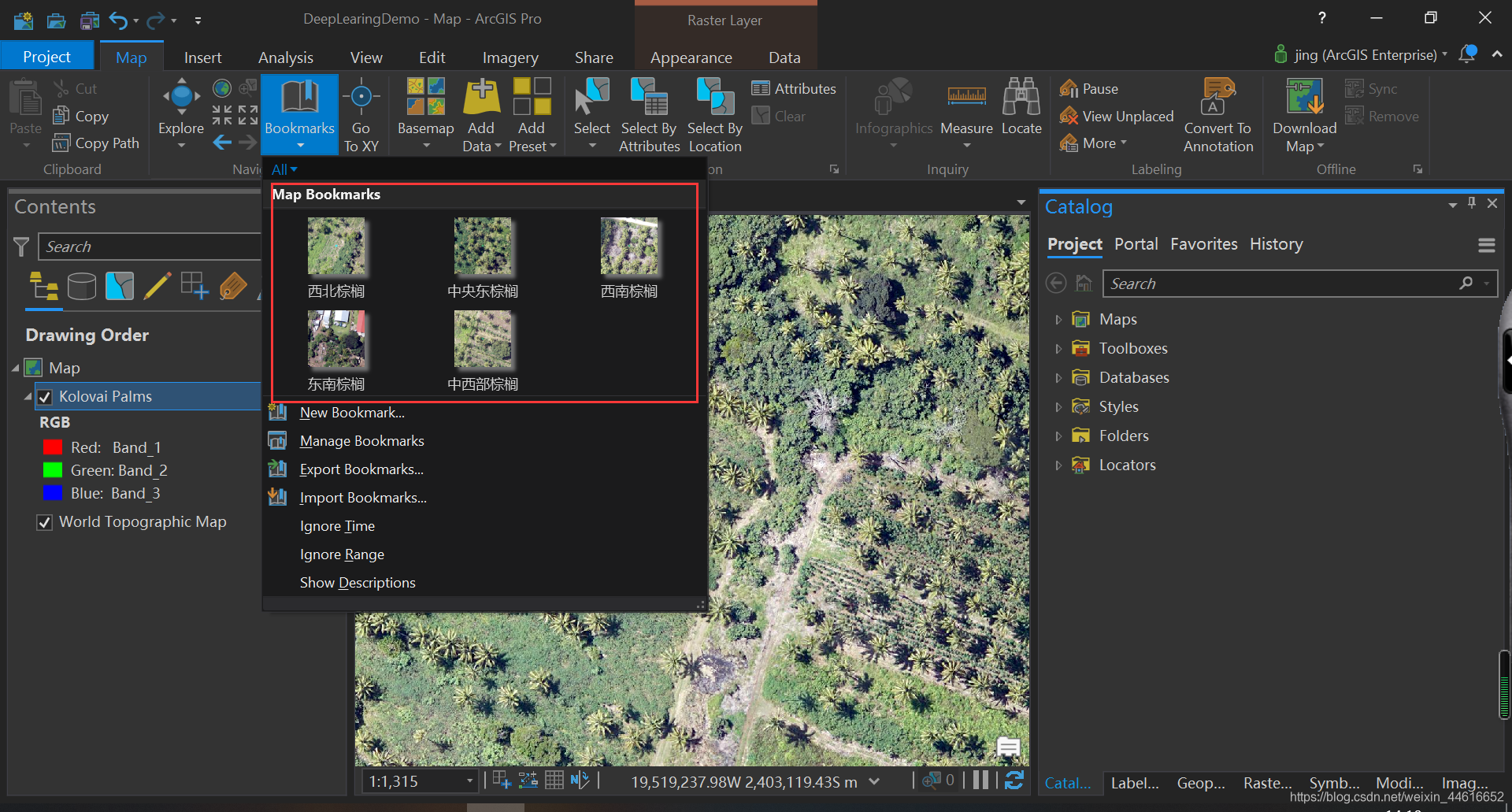 打开Map标签下的Locate功能,搜索如下几个坐标,将地图切换至1:500比例尺,创建书签。