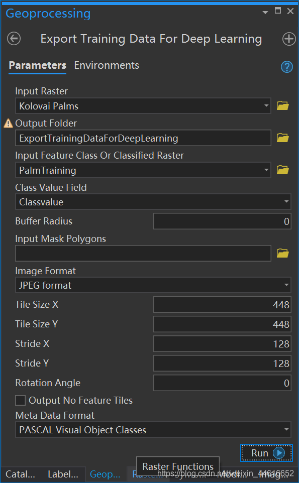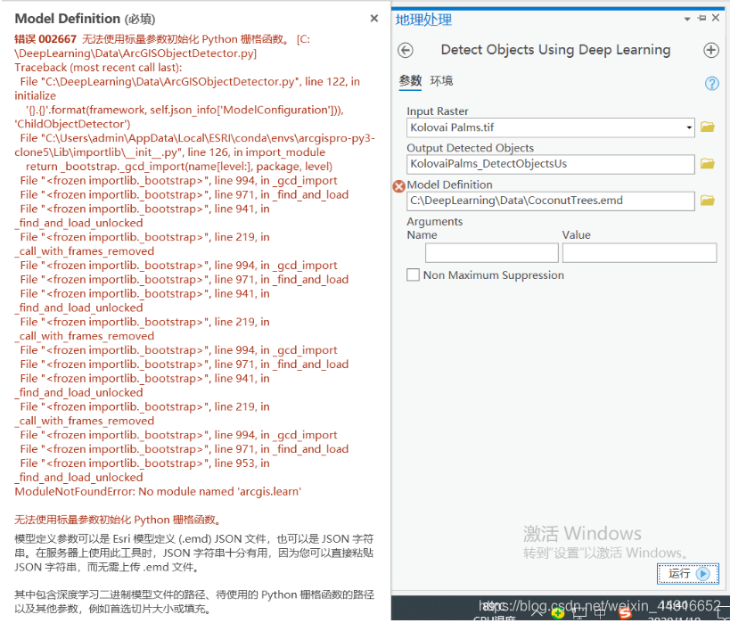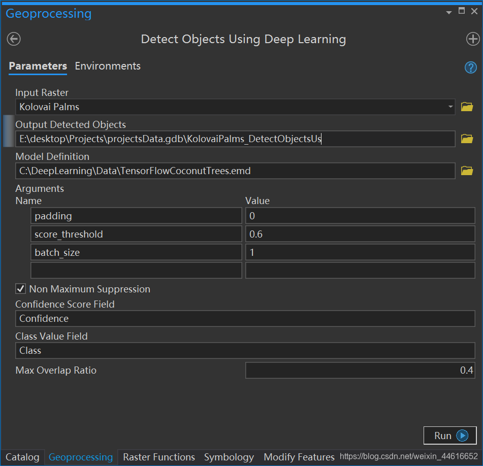 因为在上文中准备好了工程,python环境、Pro也重启了,这里需要在地理处理工具中搜索Detect Objects Using Deep Learning工具,并按照下图方式填写