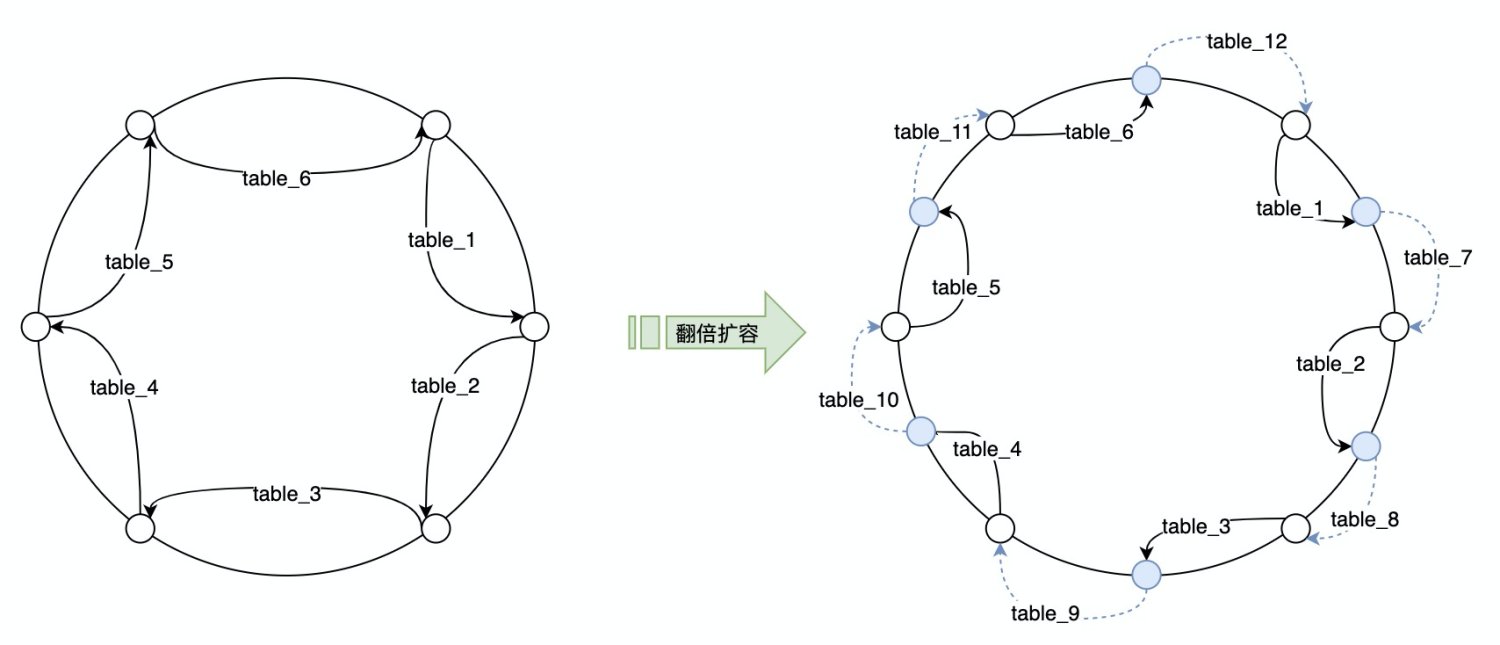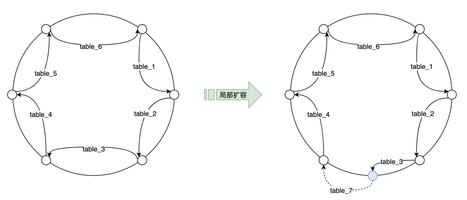 局部扩容:一致性hash通过在局部增加节点实现灵活扩容,而不必每次都翻倍扩容,可以对热点数据表进行再拆分,只影响新节点到逆时针第一个节点之间的数据,但是需要额外再维护映射表保证其他节点还映射到旧表。