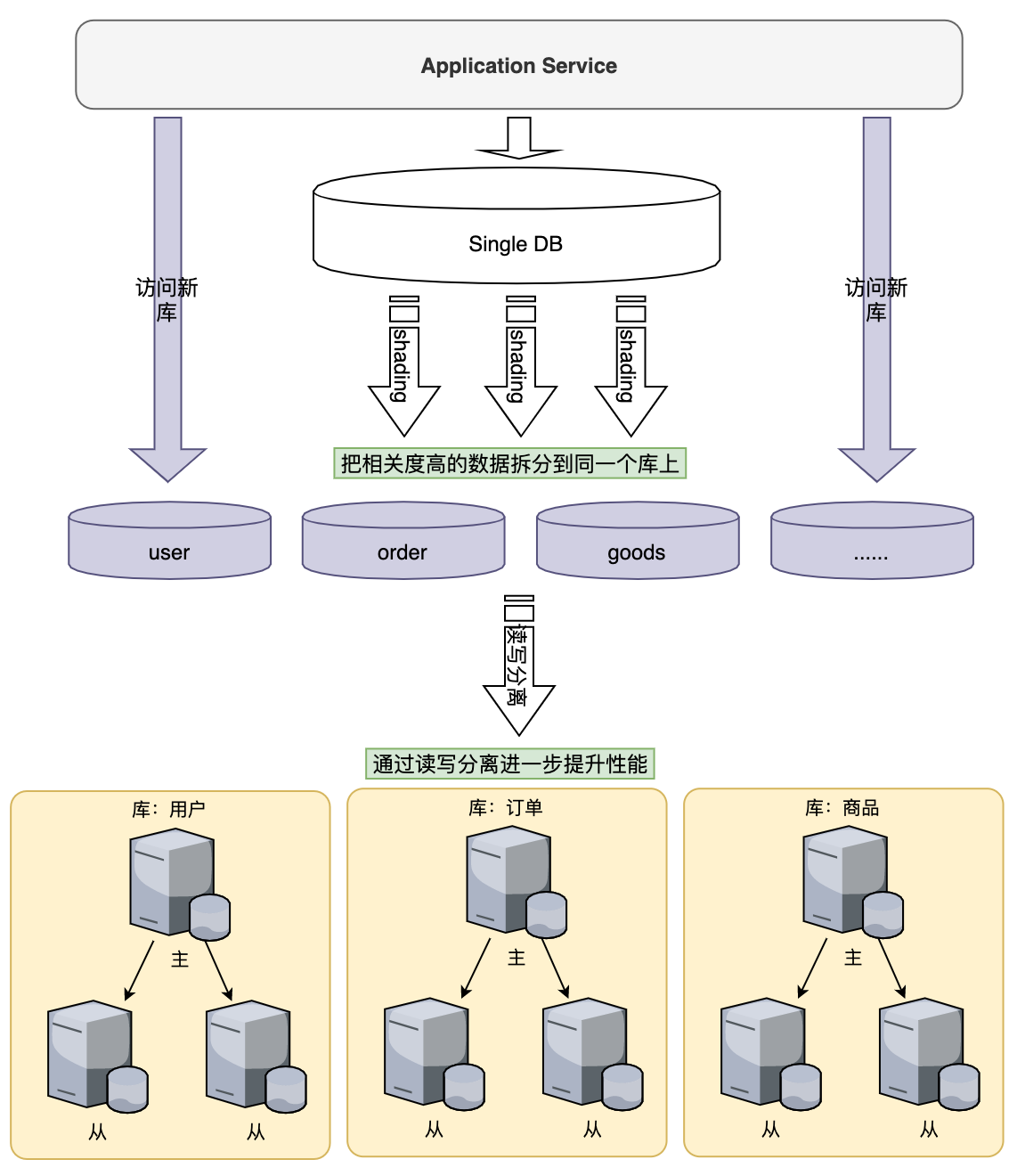 拆分了之后还可以继续做读写分离进一步提升性能,但垂直拆分也带来了问题,原本在一个事务中的数据操作,在拆分之后就无法在同一个事务中完成,这使得我们业务应用需要额外的成本去解决,如通过引入分布式事务 或 最终一致来解决。