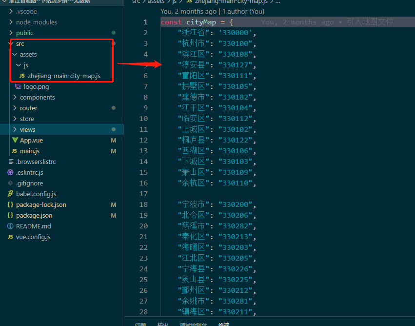 有了这个命名规律,那在用axios请求地图包的json数据时,可以先对已有的地区ID做处理,这里需要说明的是,地区ID 也就是刚才我们一一对应的js中的id值,具体代码如下: