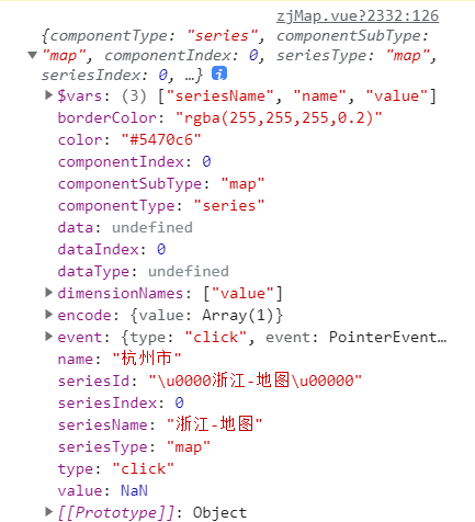 这个是地图区域点击后的行为;地图下钻嘛,肯定是 点击后,下钻到当前地区的下一级,那onClick方法就是来解决这个,在点击后,可以获取到三个属性(event),如下: