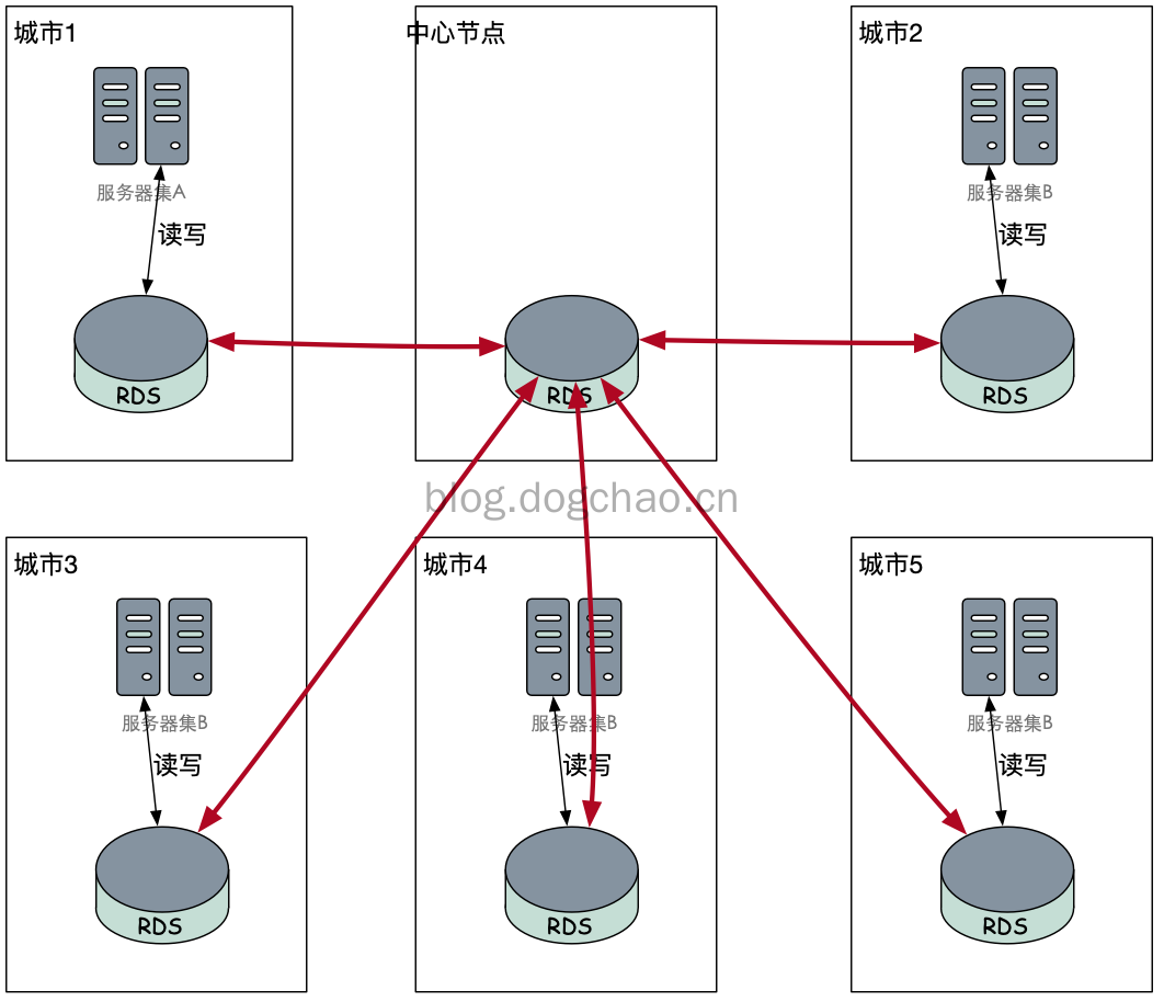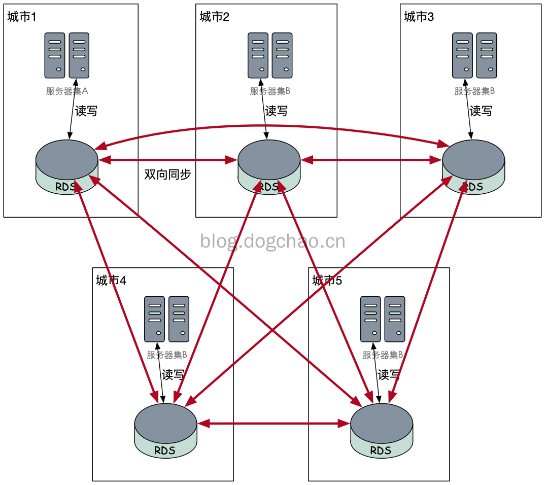 实际上我猜测很多业务也是按照上图去实现的,比如滴滴打车业务这种,所有的业务都是按城市划分开的。用户、车主、目的地,他们的经纬度通常都是在同一个城市的。单个数据中心并不需要和其他数据中心进行数据交互,只有在统计出报表的时候才需要,但报表是不太注重实时性的。那么,在这种情况下,全国的业务其实可以被很好的 sharding 的。