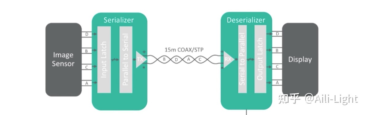 以ADAS摄像头为例,一般来讲,摄像头除了对外发送捕获到的图像数据外,还会发送帧同步信号,像素时钟等信息,此外还有电源供给等等,因此它需要由许多信号线组成的一个并行总线。如之前所说,并行总线在高速的数据传输过程中,是不占据优势,因此我们需要将这些并行的信号合并为串行信号,再通过更高频率进行传输。