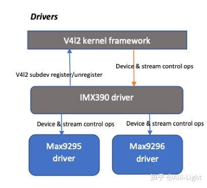 驱动层的结构如图6所示,驱动最上层是v4l2的架构,是Linux系统下的通用相机驱动框架。中间层是sensor驱动,用于控制视频流的开关、设置图像参数等。最底层是MAX9295/9296的驱动,负责拉通数据链路。