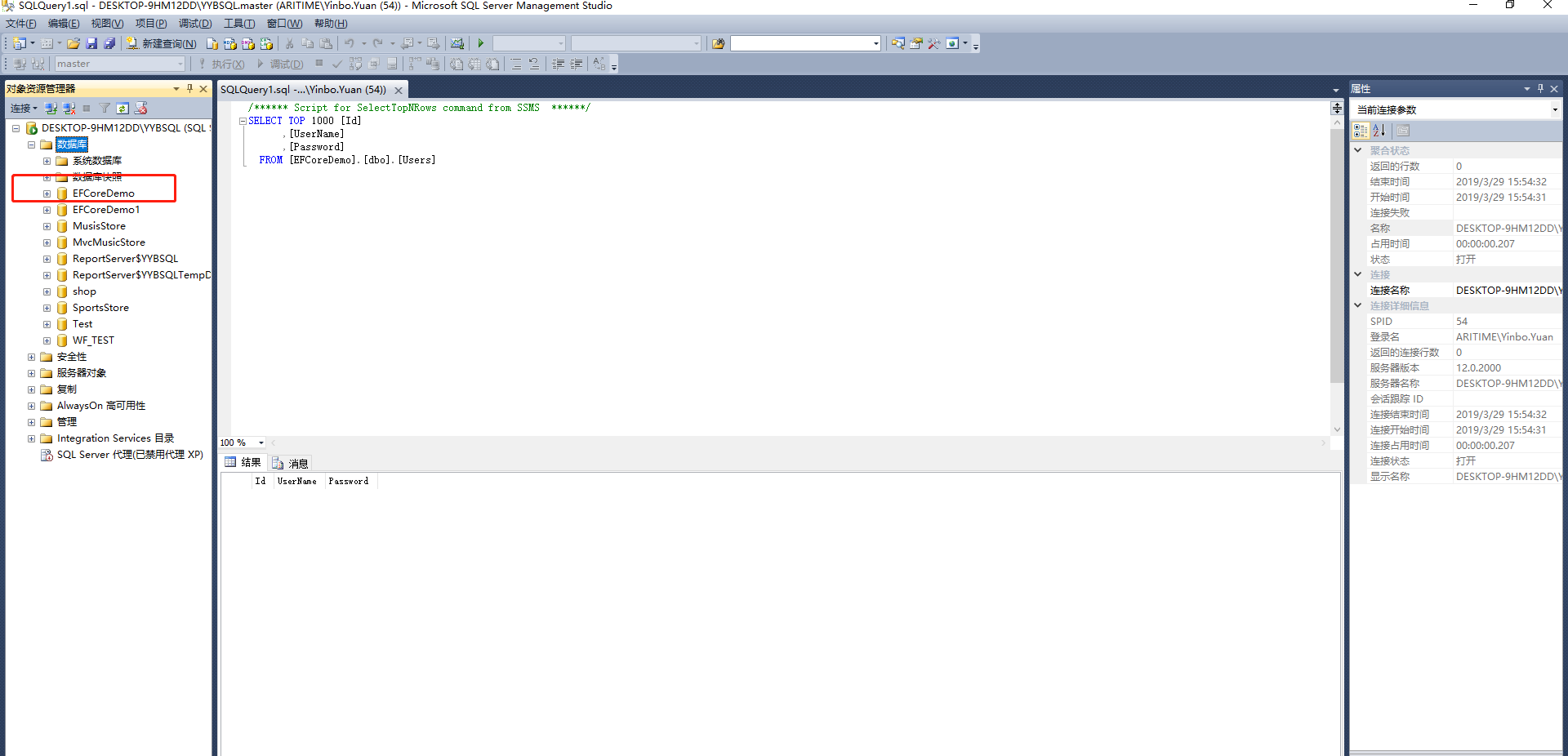 var connection = @"server=DESKTOP-9HM12DD\YYBSQL;database=EFCoreDemo;integrated security=SSPI;";//windows身份验证
