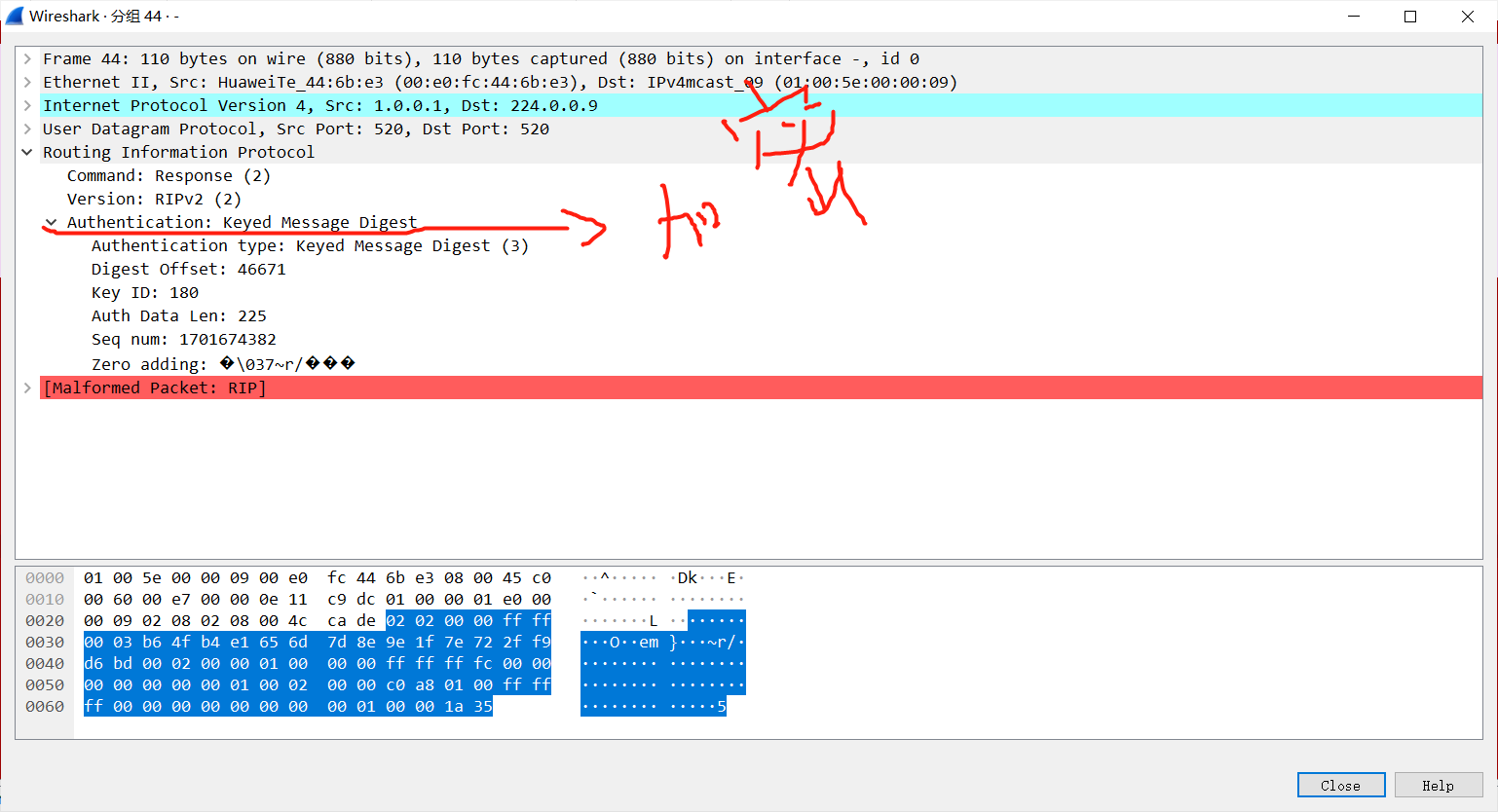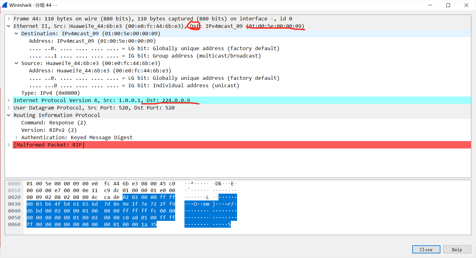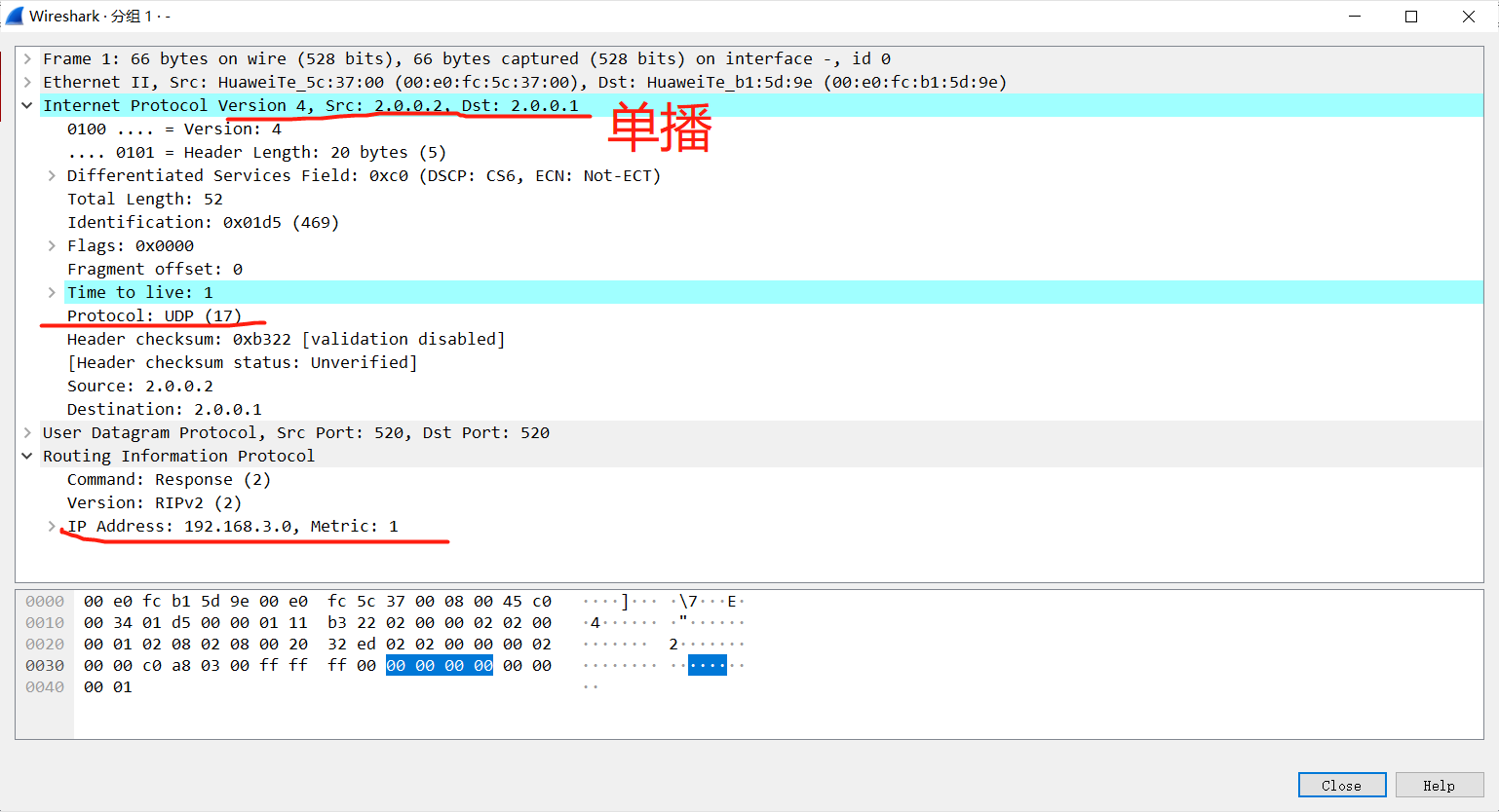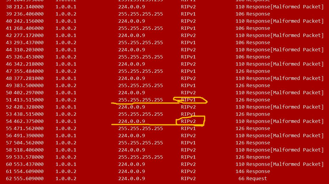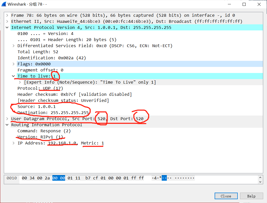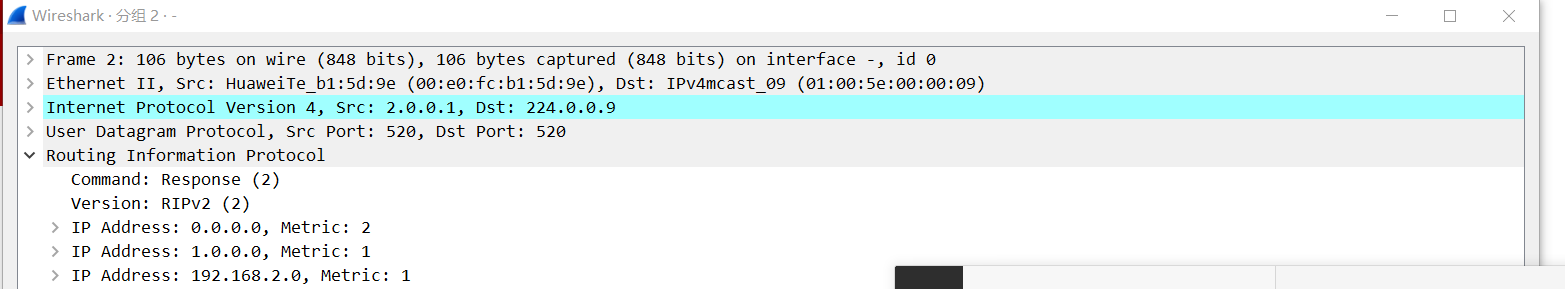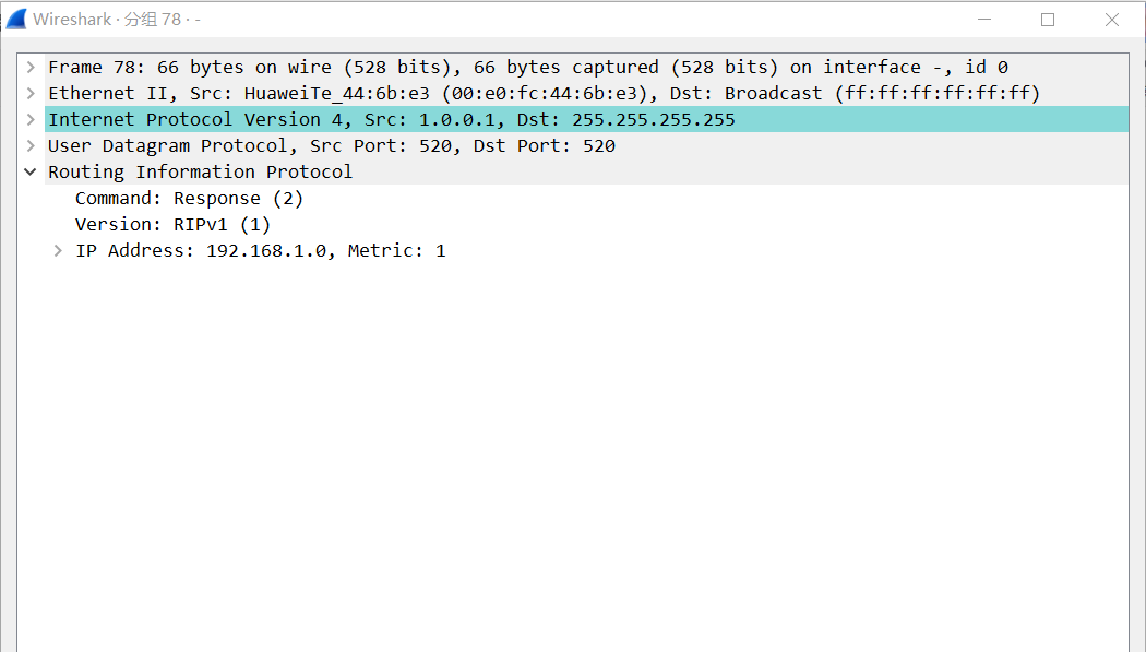 抓包查看:首先这个是V1的包,采用广播,TTL为1 ,metric为度量值,使用520端口的UDP协议