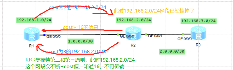 但是这个时候R1发送来2.0/24的刷新信息cost为2的R1的路由信息,此时根据贝尔曼福特算法第三条,R1的cost的开销值小于cost16,所以R2的cost16的信息无法发出,而被R1不断刷新直到cost从2到16 [此时R2也会不断转发这个路由信息,知道cost叠加到16] --- 贝尔曼福特算法可以自己破环,但是极度占用链路资源。 [R2和R3也是同理]