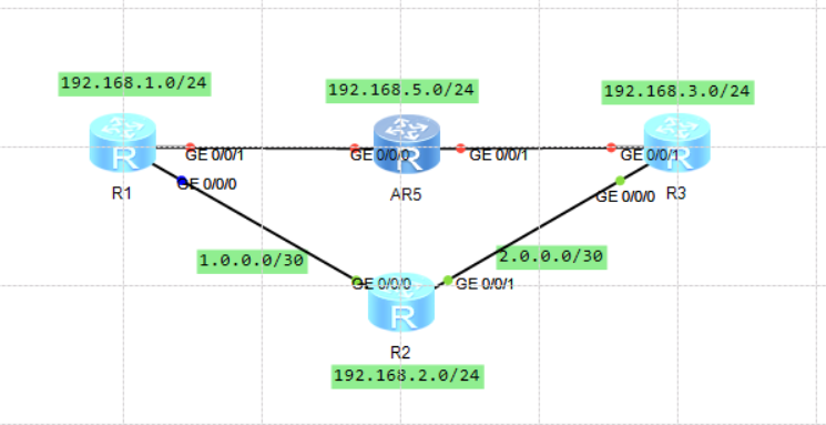 - R2收到R1发送的192.168.5.0/24网段的信息,但是R2本地路由表中有该网段的路由信息;则查看下一跳,本地路由表中的下一跳不是R1(可能是R3);这个时候比较本地路由表上到192.168.5.0/24网段开销值。若本地开销值大于R1发来的路由开销值,则将R1发的路由信息刷新到路由表中
