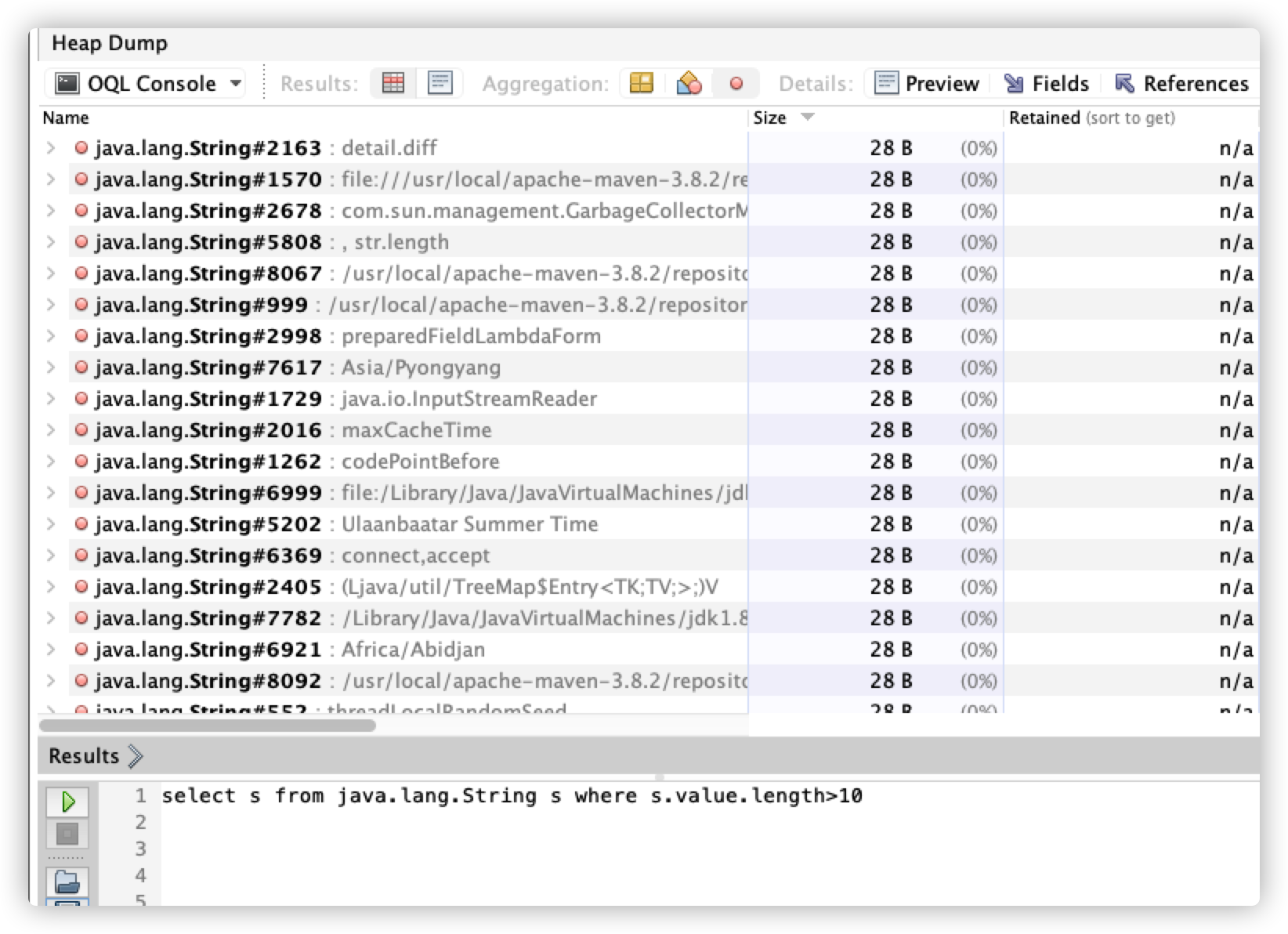 4、关于 OQL Consle、可知的是该面板是运行 OQL 查询语句的,是对 HeapDump 进行查询,类似于 SQL 的查询语言。OQL由3个部分组成:select 子句、from 子句和 where 子句。select 子句指定查询结果要显示的内容。from 子句指定查询范围,可指定类名,如java.lang.String、char[]、[Ljava.io.File;(File数组)。where子句用于指定查询条件。