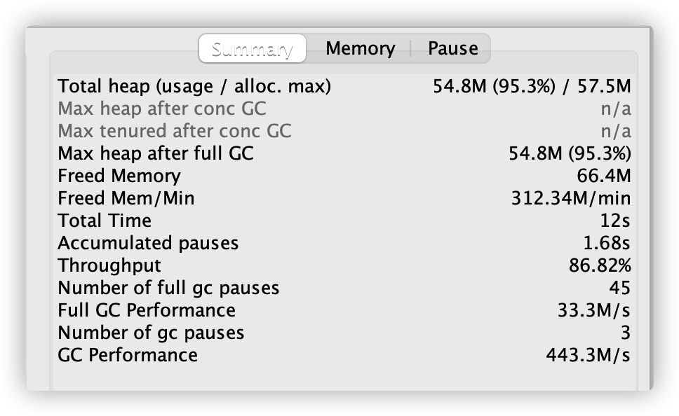 Throughput(吞吐量):上图显示是 86.8%,有些系统要求吞吐量至少为 90%,那么就说明需要进行 GC 优化。