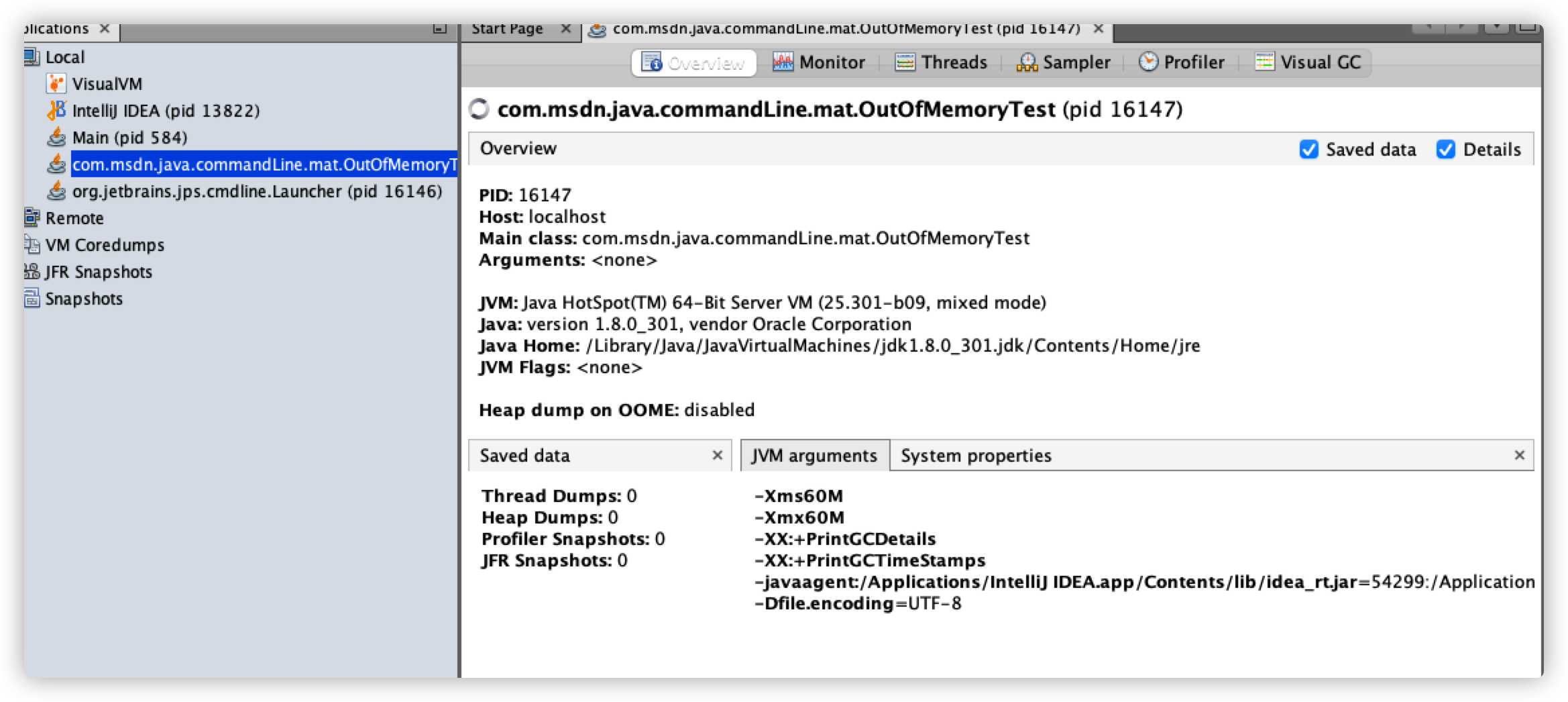 还是继续使用上文的本地案例,执行上述程序,在 VisualVM 页面左侧双击程序对应的进程,首先进入 Overview 页面。