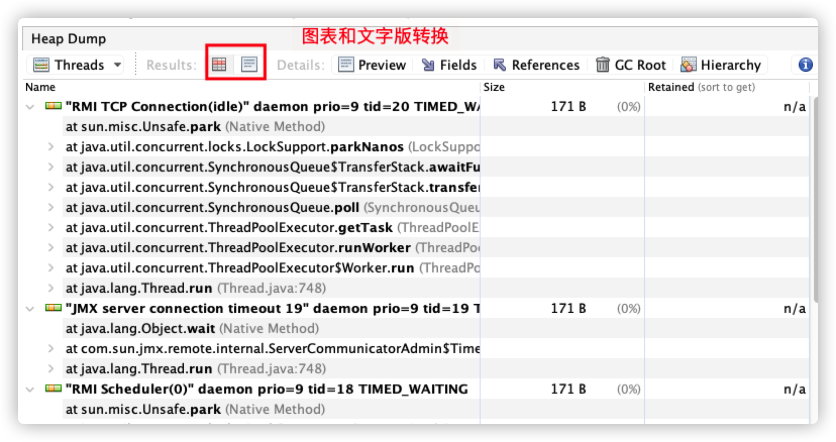 上面出现的 Monitor Ctrl-Break,大家可能不明白是个什么东西。这里简单提一下,这个线程是在 IDEA 中才有的,而且还是用 run 启动方式才会出现,如果是 debug 启动方式,则不会出现。