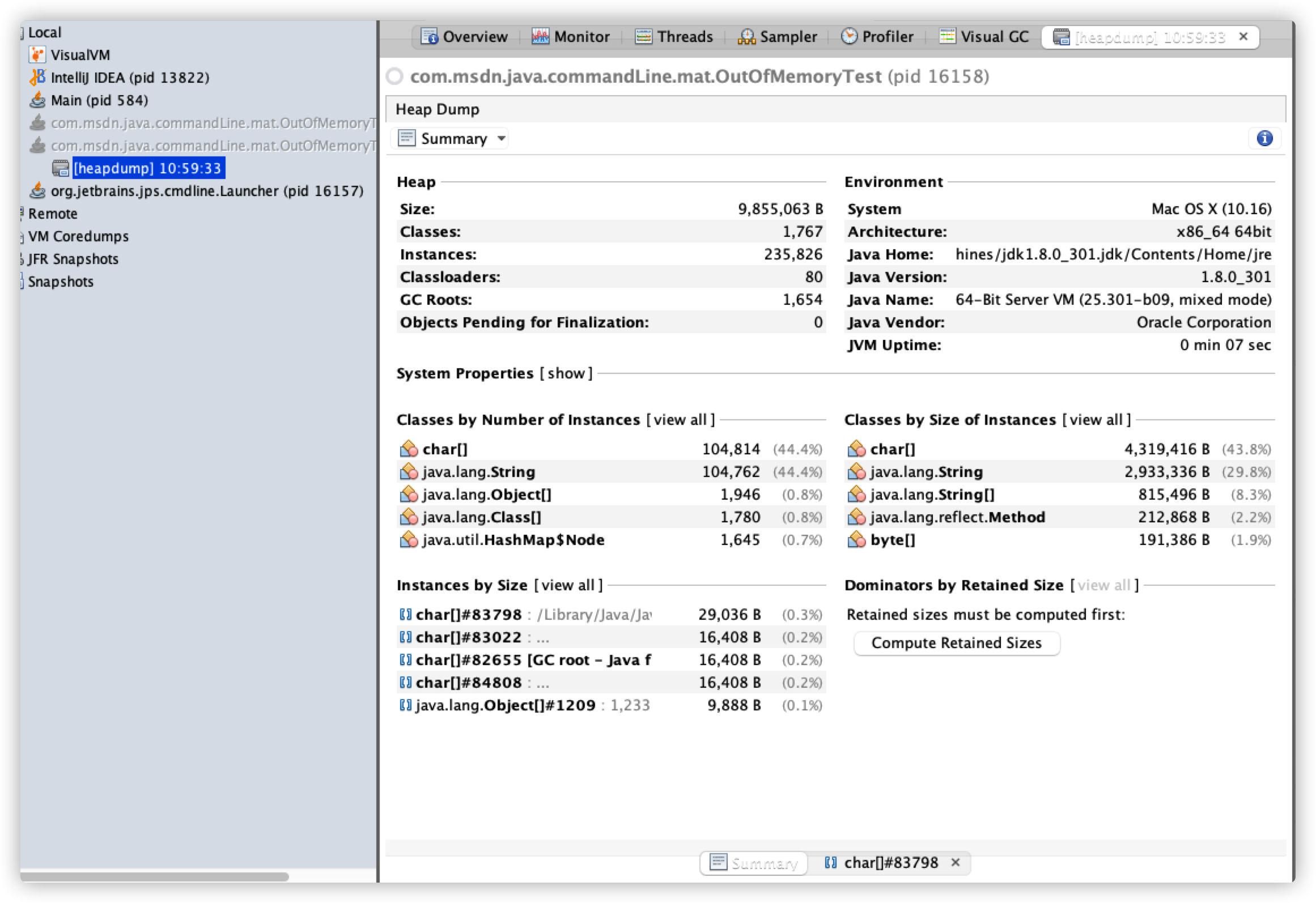 这个界面和 MAT 工具解析得到的内容很像,所以说 VisualVM 功能很强大。