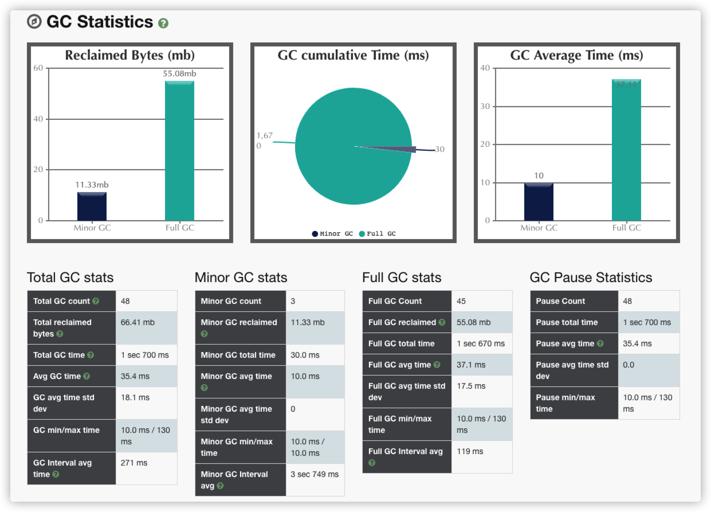 如果你的 Full GC 平均的暂停时间很长(大于1s),或者平均暂停间隔非常的短(小于10s),说明可能你的 GC 回收是有问题的,可能需要优化。