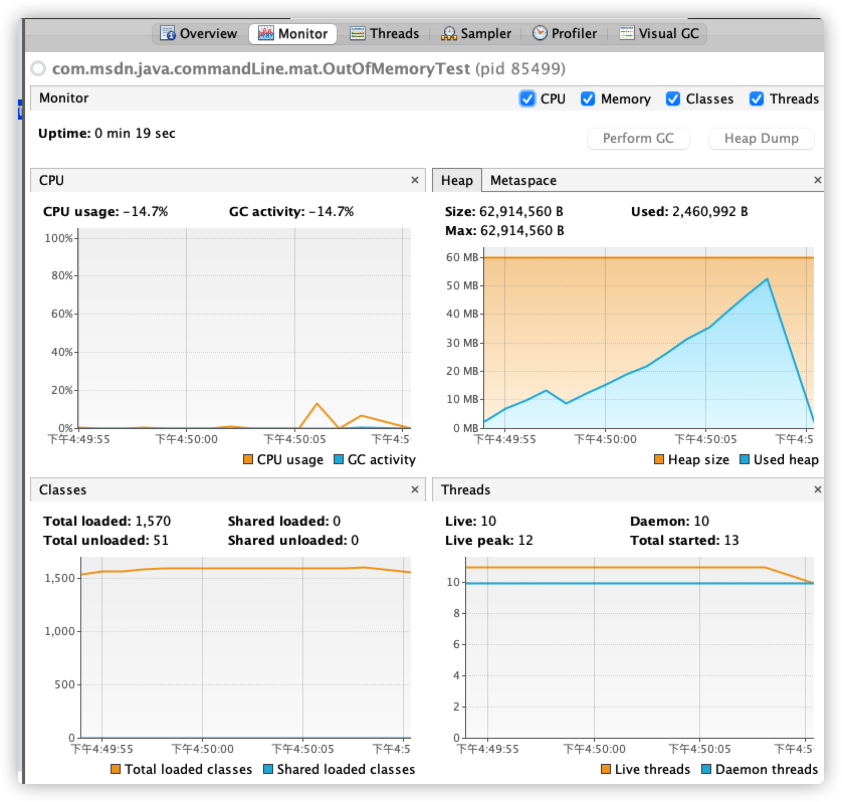 点击页面上的 Monitor,可以监控应用程序 CPU、堆、方法区、类加载和线程数的总体情况。如下图所示:
