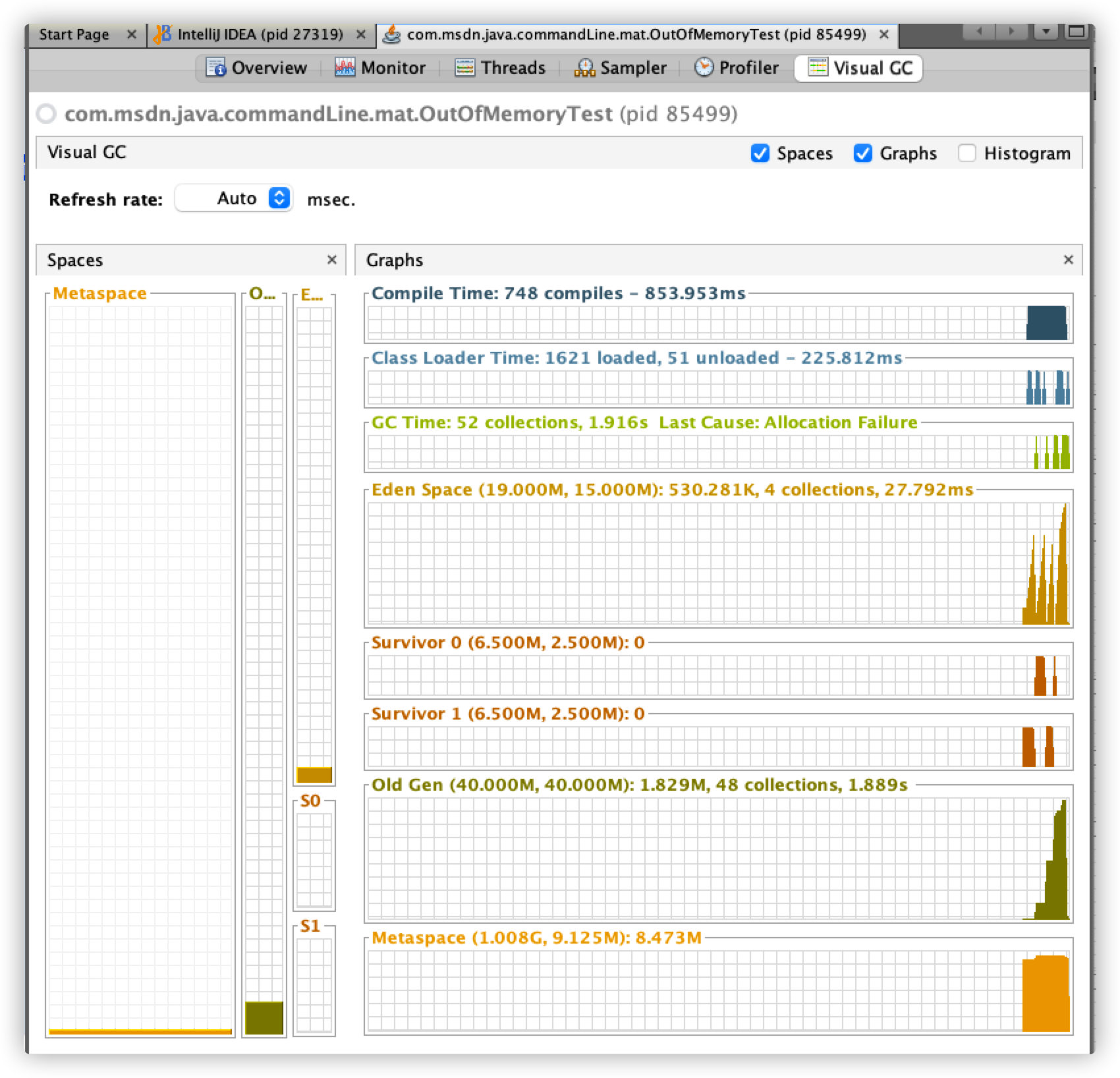 关于 Visual GC 插件的使用推荐阅读:Visual GC 插件使用 ,文章还介绍了 Spaces、Graphs 和 Histogram 这三块区域的含义。