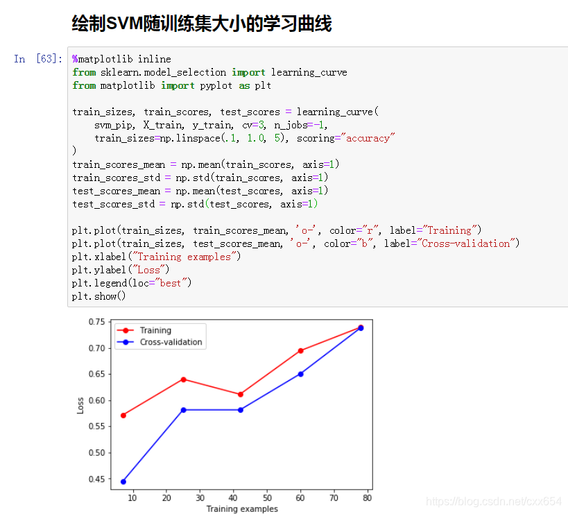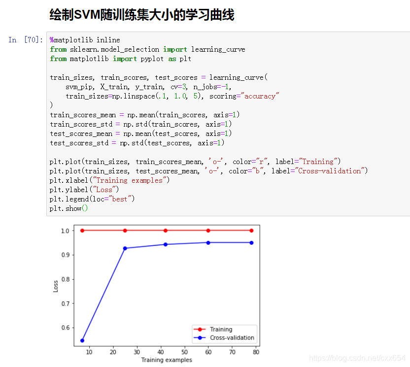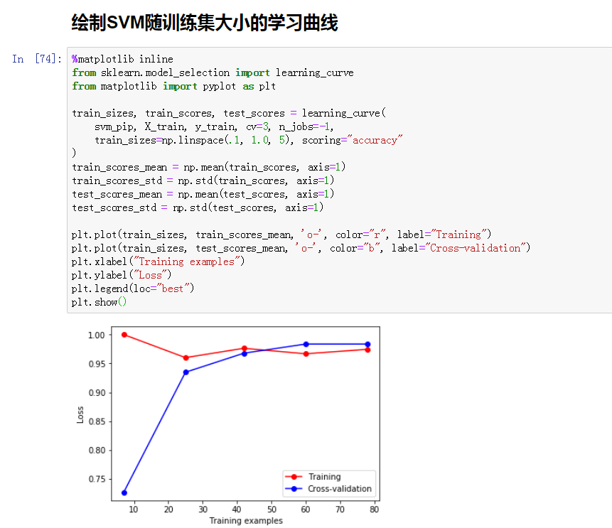 以iris数据集合SVM分类器为例,使用sklearn的learning_curve函数绘制分类器的学习曲线,并根据学习曲线判断模型的状态,是欠拟合还是过拟合。