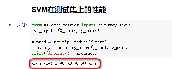 模型在测试集上的预测准确率在96%,与之前交叉验证的结果以及学习曲线的最终收敛结果相当,说明模型在未知数据上的泛化效果还不错!!!