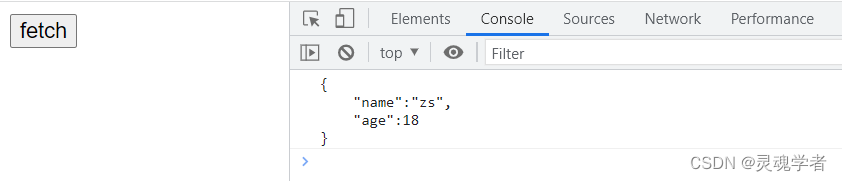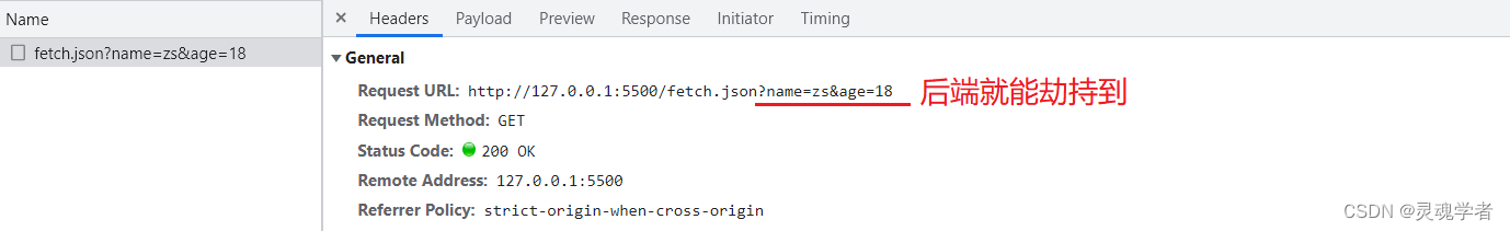 我们知道get和post请求方式不同,get请求后端只有一种接收的方式,即将上述代码换成fetch( "fetch.json?name=zs&age=18" ),可以在浏览器过滤看到: