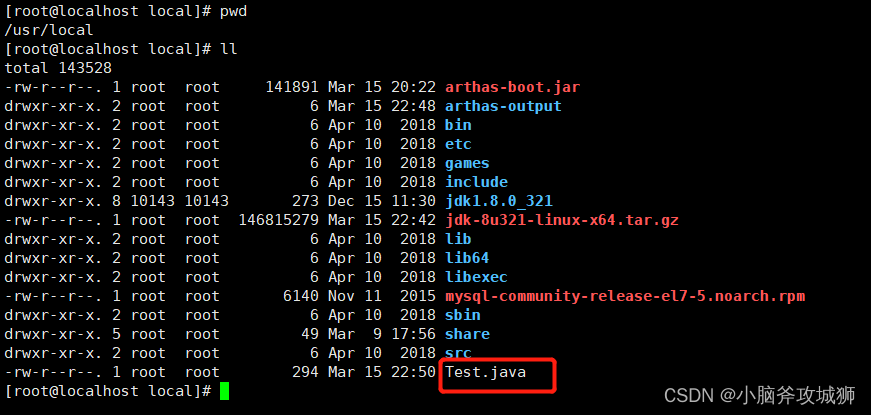 }(2)上传Test.java文件到Linux服务器下,/usr/local