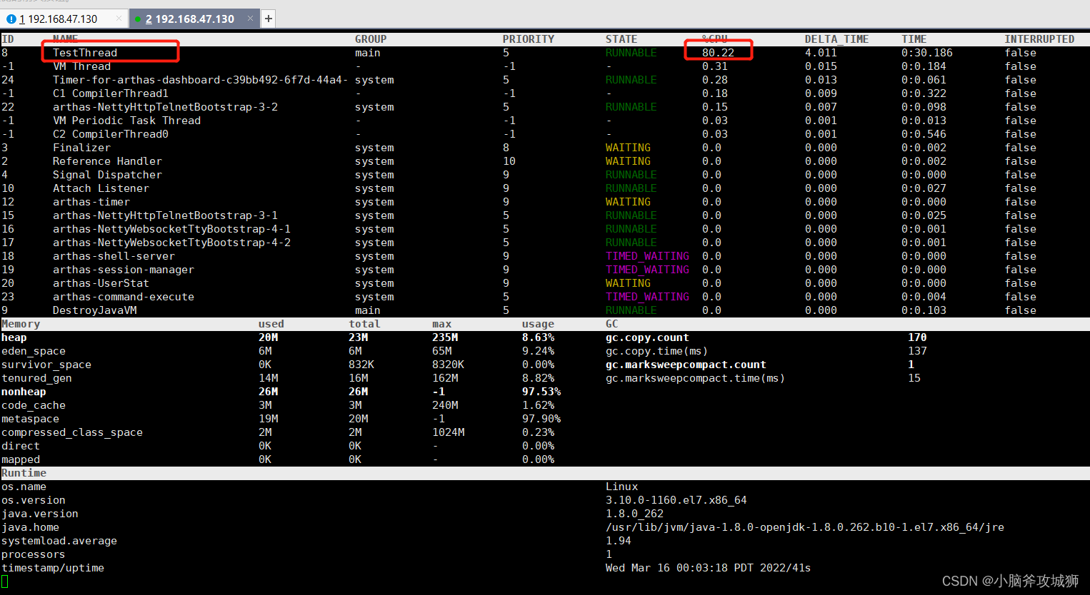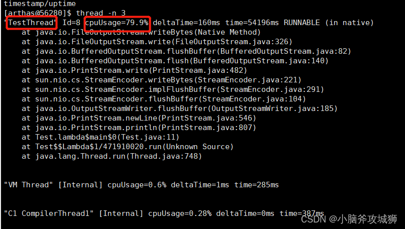 从图中能很清楚的看到TestThread线程 cpu占比80.22%