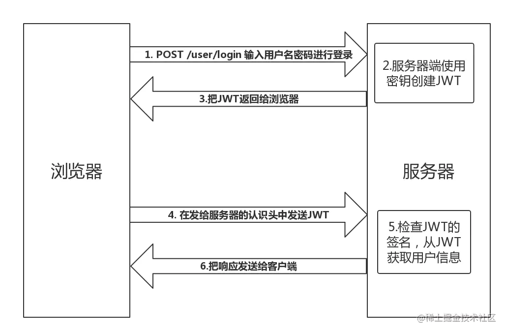 - 服务端的保护路由将会检查请求头 Authorization 中的 JWT 信息,如果合法,则允许用户的行为。