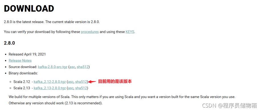 以kafka_2.12-2.8.0.tgz为例,2.12表示scala的版本,因为Kafka服务器端代码完全由Scala语音编写,”-“ 后面的2.8.0表示的kafka的版本信息,kafka的命名都是遵循这个规则的。但是Kafka新版客户端代码完全由Java语言编写,当然,不是Scala不行了,那是因为之前的Scala程序员隐退了,所以在社区找来了一批Java程序员来写Kafka新版客户端。