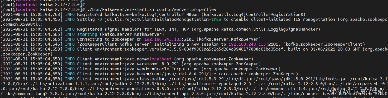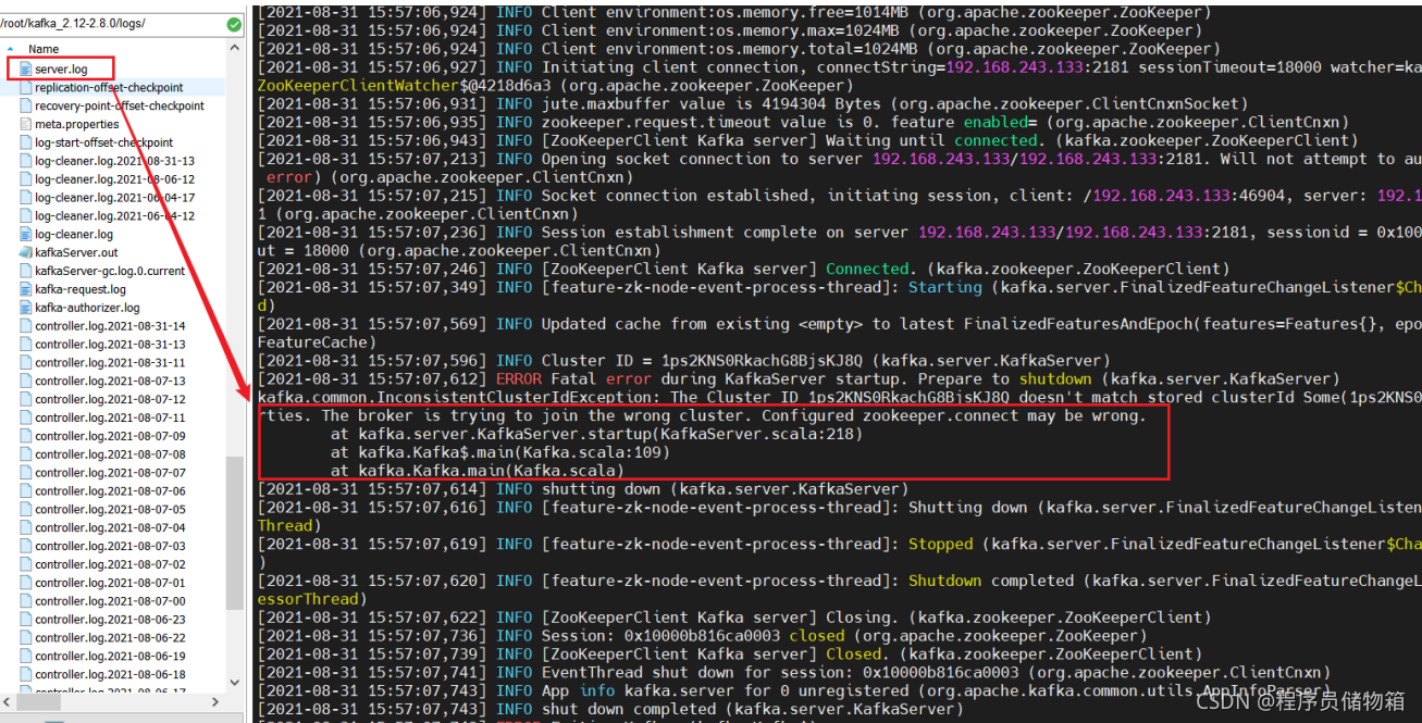 去到/root/kafka_2.12-2.8.0/logs下的server.log日志文件中查看报错问题: