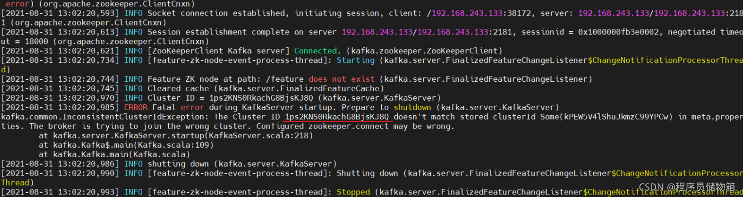 3)在我第二次启动Kafka服务时候报错The broker is trying to join the wrong cluster. Configured zookeeper.connect may be wrong.(翻译下:代理正在尝试加入错误的群集。配置的zookeeper.connect可能错误。)
