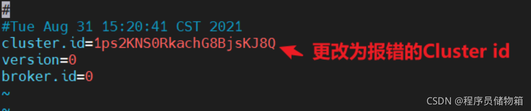 打开该日志目录(/root/kafka_2.12-2.8.0/logs)下的meta.properties文件,更新cluster.id=【报错的Cluster ID】,并保存文件。