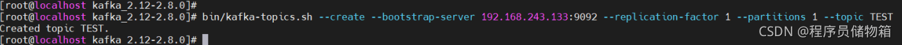 bin/kafka-topics.sh --create --bootstrap-server 192.168.243.133:9092 --replication-factor 1 --partitions 1 --topic TEST