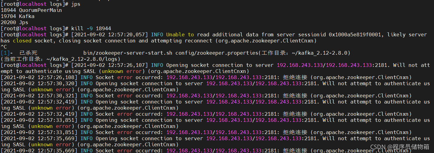 下面通过杀死已存在的zookeeper服务器进程,来查看kafka服务器的报错情况。其实再重启zookeeper服务器,kafka服务器就会自动连上了。
