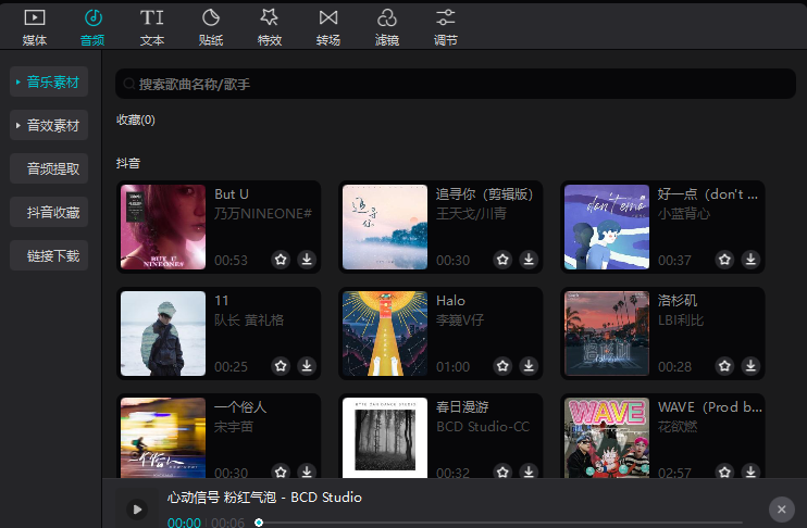 2、音频内则是我们需要对音频操作的一些内容,包括抖音内的音乐素材,因素素材包括各种乐器,效果合成器音效,大笑等等内容,音频提取则是方便我们提取视频文件中的音频;抖音收藏是我们账号在抖音内收藏的音乐,链接下载则是抖音分享的视频或者网络音乐链接提取音频。