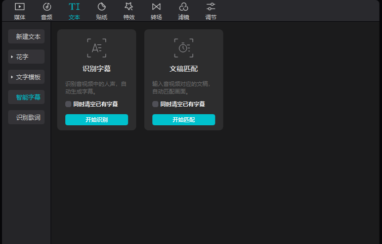 3、文本选项卡中内容为帮助我们再视频中添加文案,其中也包括了一些预设好的带动画效果的文案,我们只需填入内容即可,如果涉及到一些我们需要的字体但是这里面没有的我们也可以在安装文件夹→资源文件夹→字体中自己安装(安装到Windows的字体剪映会自己识别,这点还需自己实践下)智能字幕与识别歌词功能在后面中尝试下,在此不赘述了。