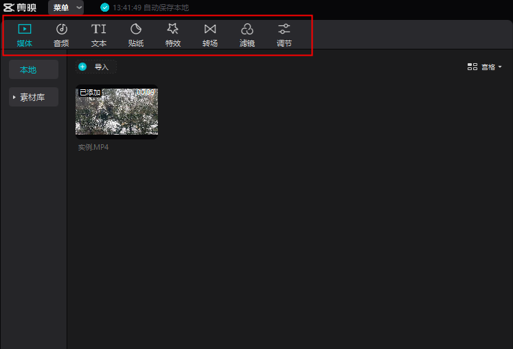 1、媒体中本地就是本地素材通过导入或者拖进来都可以添加,素材库内则是一些常用的小素材,比如2000年后,比如大笑等素材。