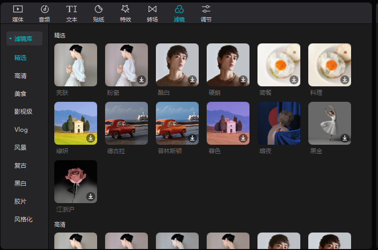 7、滤镜,滤镜可以加在视频主轨上,也可以加到分轨道上自己确定长短等。如下图所示就是两种添加方案。