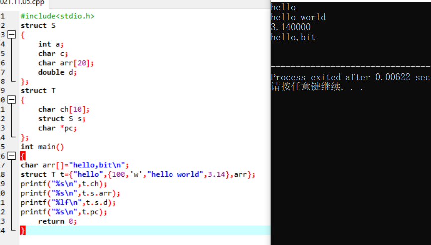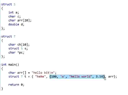 struct T t={"hello",{100,'w',"hello world",3.14},arr};