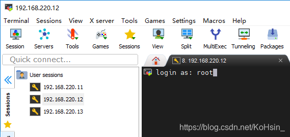因为现在我们一直在新创建的用户中,所以权限各种被限制,我们要切换回root用户来执行修改,但是通过指令也切换不过来,所以我们要重新开一个窗口(我用的是MobaXterm连接的虚拟机),然后输入root账户进行登陆