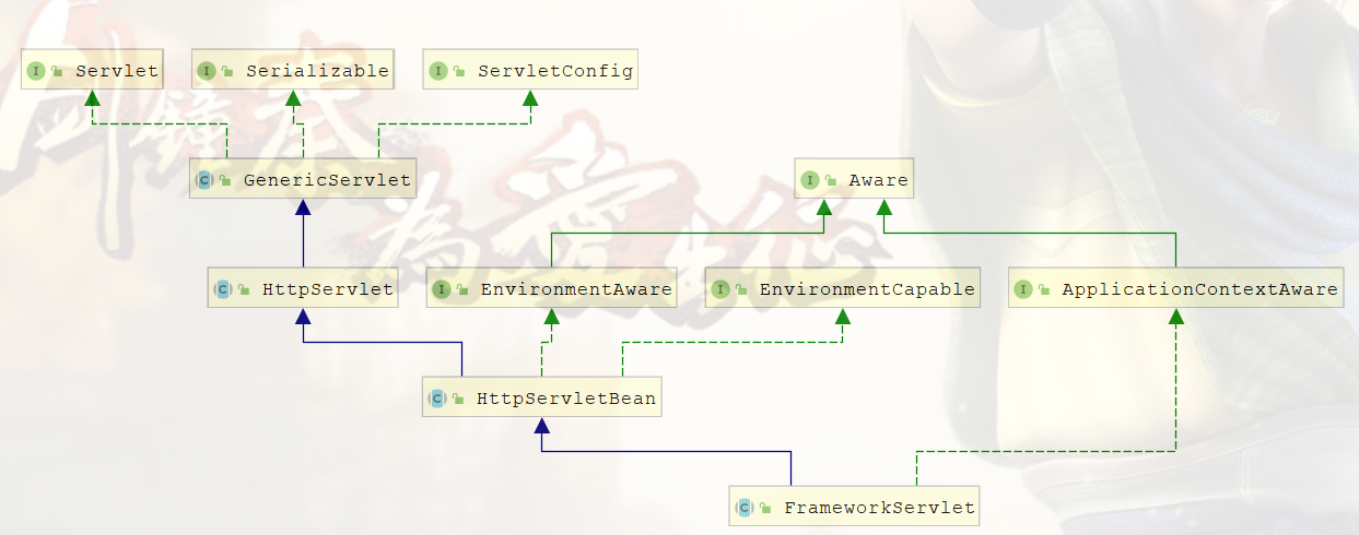 如上类图,便可清晰看到继承关系,而DispatcherServlet继承 FrameworkServlet 抽象类,FrameworkServlet 又继承 HttpServletBean类。web容器启动的时候会调用 HttpServletBean 的init方法,这个方法覆盖了GenericServlet中的init方法。源码如下: